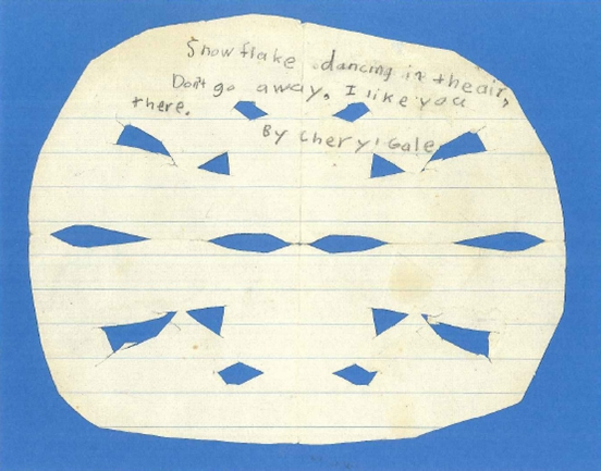 The day fit the project. There was a biting crispness to the air and a silvery grayness to the sky that had already stirred the hearts of the students toward hopeful thoughts of snow. With little scissors awkwardly grasped, chubby fingers maneuvered the folded white pieces of paper, carefully snipping out tiny triangles, circles, and squares. Mrs. Green, the first-grade teacher, watched with amusement as her students approached the task with glee. With the last ‘snip’, Mrs. Green announced “Now unfold the paper”, and with gasps of delight, each child beheld the beauty of their own unique creation. She then asked each child to write anything they wished upon his or her newly created snowflake. With pencil in hand, I wrote “Snowflake dancing in the air, don’t go away. I like you there.”