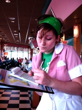 and calls out to the lunch-time crowd, “can you spare a dime?”